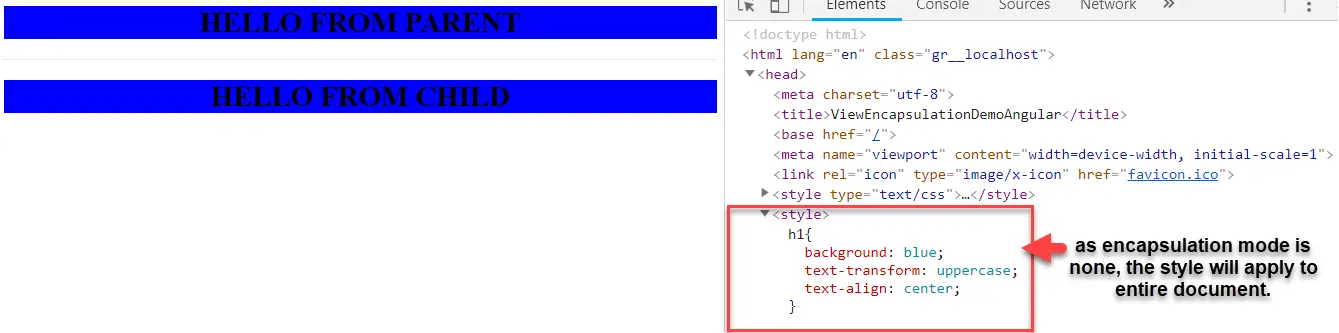 在demo组件中,我们还使用h1选择器来显示title。当我们将ViewEncapsulation模式设置为None时,相同样式的父组件将分配给子组件。在下面找到demo组件。