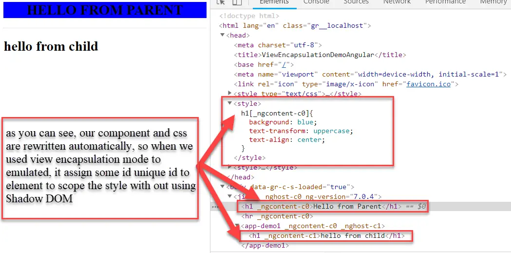 它已经为我们的样式分配了ID _ngcontent-c0,并且为我们的app.component的h1选择器分配了相同的ID,但是对于demo组件的h1选择器,它分配了不同的ID和_ngcontent–c1。