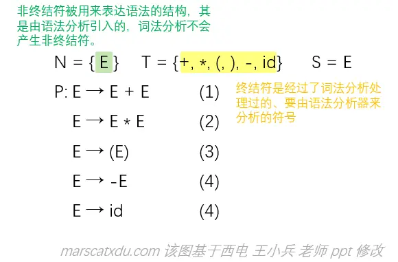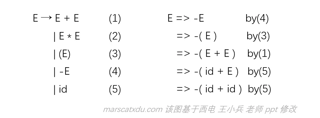 注意,CFG 一旦定义完成,语法也随之定义完成了。因此,对于一个句子的合法性检查,就要根据我们定义的 CFG 来做。比如,如果按照上面这个例子的语法定义来看,“- - - - - id” 就是一个合法的句子,而 “ id - id ” 却不合法。若想要其合法,我们需要在产生式中追加 “ E→ E - E ” 。