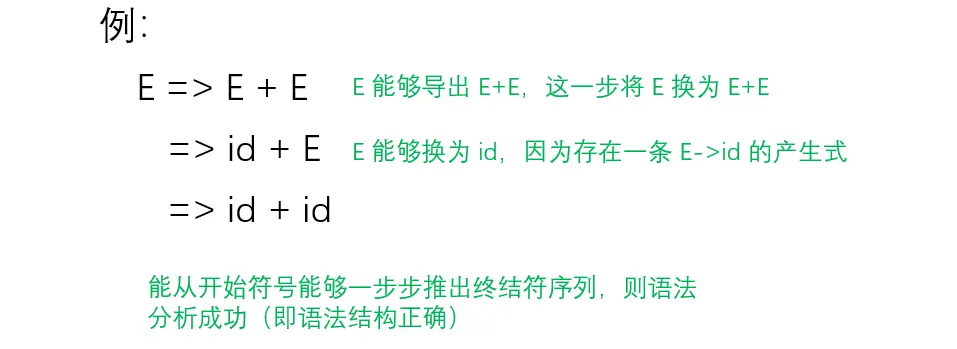 若能够进行这样的推导: E=>E+E=>id+E=>id+id,即由 E 推出了 id+id,与从词法分析器那里得到的 id+id 相同,则说明语法结构正确。