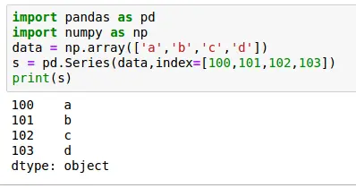 1 2 3 4 5 | import pandas as pdimport numpy as npdata = np.array(['a','b','c','d'])s = pd.Series(data,index=[100,101,102,103])print(s) |