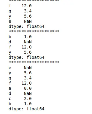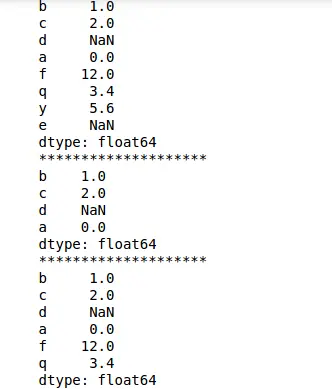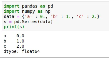 1 2 3 4 5 | import pandas as pdimport numpy as npdata = {'a' : 0., 'b' : 1., 'c' : 2.}s = pd.Series(data)print(s) |