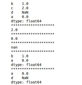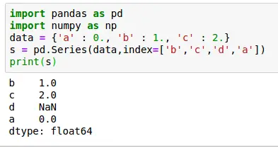 1 2 3 4 5 | import pandas as pdimport numpy as npdata = {'a' : 0., 'b' : 1., 'c' : 2.}s = pd.Series(data,index=['b','c','d','a'])print(s) |
