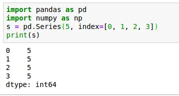 1 2 3 4 | import pandas as pdimport numpy as nps = pd.Series(5, index=[0, 1, 2, 3])print(s) |