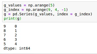 1 2 3 4 | g_values = np.arange(5)g_index = np.arange(9, 4, -1)g = pd.Series(g_values, index = g_index)print(g) |
