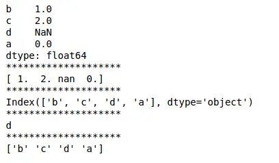 01 02 03 04 05 06 07 08 09 10 11 12 13 | import pandas as pdimport numpy as npdata = {'a' : 0., 'b' : 1., 'c' : 2.}s = pd.Series(data,index=['b','c','d','a'])print(s)print('**'*10)print(s.values)print('**'*10)print(s.index)print('**'*10)print(s.index[2])print('**'*10)print(s.index.values) |