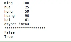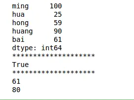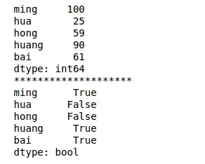 1 2 3 4 5 6 7 8 | import pandas as pdimport numpy as nps = pd.Series([100,25,59,90,61],index=['ming','hua','hong','huang','bai'])print(s)print('**'*10)print(s['hua']>60)print(s['ming']>60) |