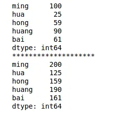 1 2 3 4 5 6 7 | import pandas as pdimport numpy as nps = pd.Series([100,25,59,90,61],index=['ming','hua','hong','huang','bai'])print(s)print('**'*10)print(s+100) # 标量运算 |