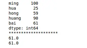 1 2 3 4 5 6 7 8 | import pandas as pdimport numpy as nps = pd.Series([100,25,59,90,61],index=['ming','hua','hong','huang','bai'])print(s)print('**'*10)print(np.median(s)) # 应用函数 , 获取中位数print(s.median()) # 方法调用的写法 |