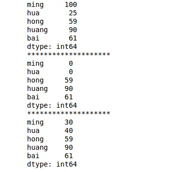 01 02 03 04 05 06 07 08 09 10 11 | import pandas as pdimport numpy as nps = pd.Series([100,25,59,90,61],index=['ming','hua','hong','huang','bai'])print(s)print('**'*10)s['ming', 'hua'] = 0print(s)print('**'*10)s['ming', 'hua'] = [30, 40]print(s) |