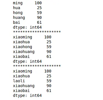 01 02 03 04 05 06 07 08 09 10 11 | import pandas as pdimport numpy as nps = pd.Series([100,25,59,90,61],index=['ming','hua','hong','huang','bai'])print(s)print('**'*10)s.index = ['xiaoming','xiaohua','xiaohong','xiaohuang','xiaobai'] # 索引修改print(s)print('**'*10)s.index.values[2] = 'laoli'print(s) |