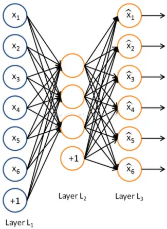 这个图就是稀疏自编码器的样例,Layer L1是输入层,Layer L3是输出层,Layer L2是隐藏层h。
