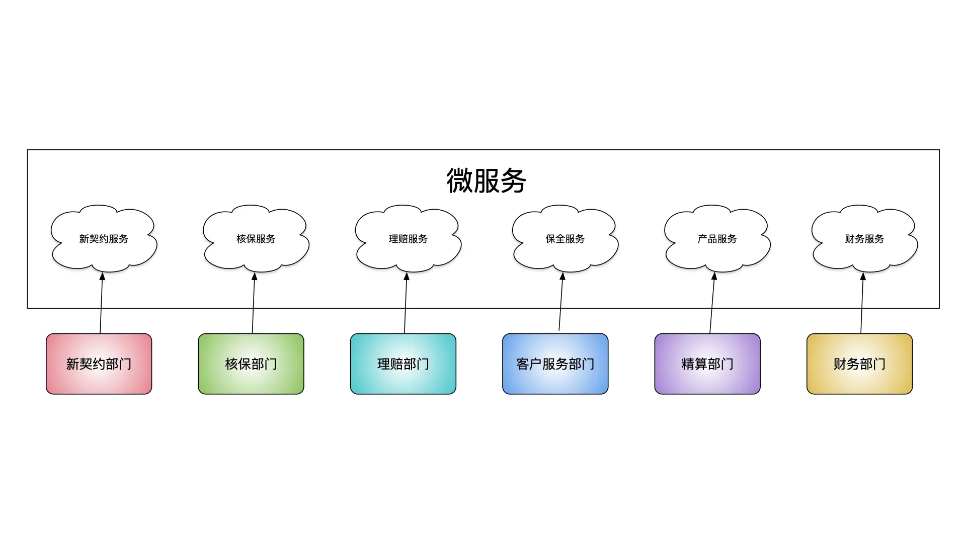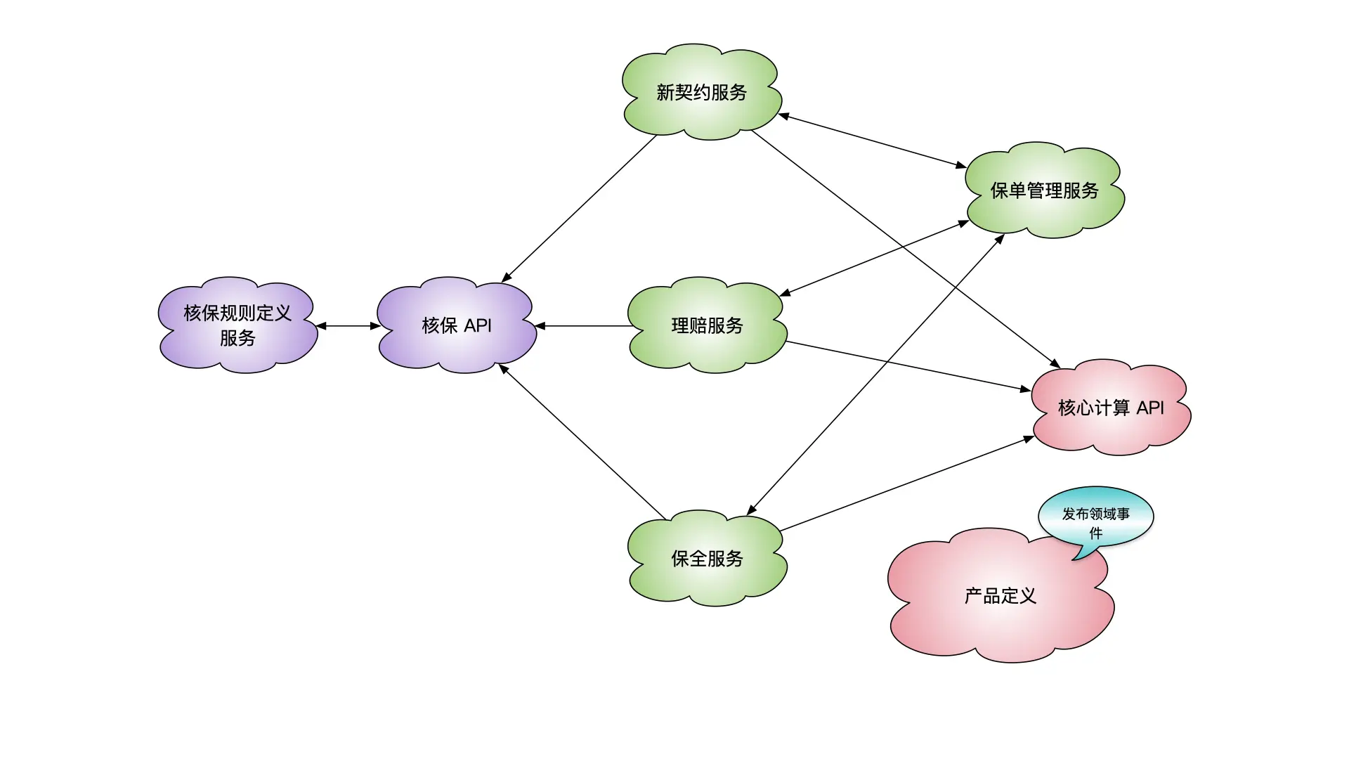 完整的保险核心业务系统服务远比图中的例子复杂,但是划分这些服务的核心思路没有发生变化,更多的从业务所解决的问题出发,而不是单纯参考部门结构和流程。