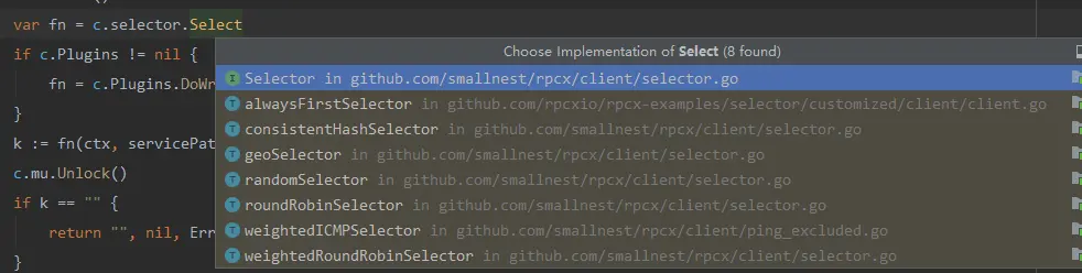 定位var fn = c.selector.Select这行代码,获取指定路由算法的Select方法,由k := fn(ctx, servicePath, serviceMethod, args)来获得服务节点。rpcx支持的路由算法有:
