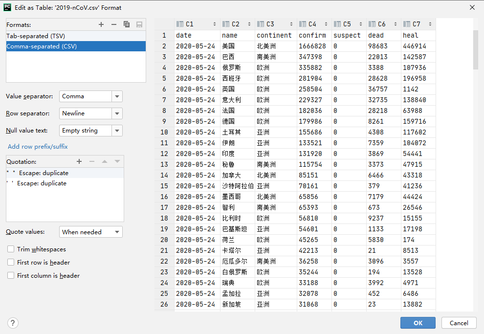fw.write(date + ',' + str(name_list[i]) + ',' + str(continent_list[i]) + ',' + str(confirm_list[i]) + ',' + str(suspect_list[i]) + ',' + str(dead_list[i]) + ',' + str(heal_list[i]) + '\n')