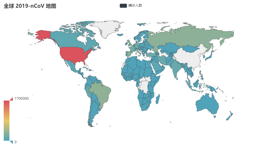 另外,在最后绘制地图的时候遇到了一个很奇葩的问题,国家名称列表和累计确诊人数列表如果是从前面的方法中获取到的,在最后渲染成 map_world.html 的时候,将不会渲染数字,所有的数字都是 null ,但是如果这两个列表 copy 出来,写死在代码中,就可以成功的渲染,有清楚这个问题的朋友可以在留言中解答一下,万分感激。
