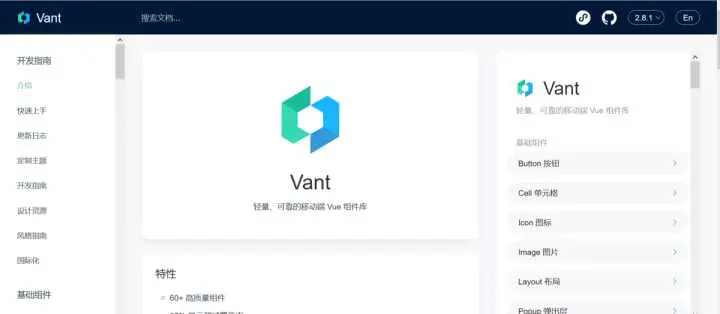 Vant 是有赞开源的一套基于 Vue 2.0 的 Mobile 组件库。通过 Vant,可以快速搭建出风格统一的页面,提升开发效率。目前已有近 50 个组件,这些组件被广泛使用于有赞的各个移动端业务中。 Vant 旨在更快、更简单地开发基于 Vue 的美观易用的移动站点。