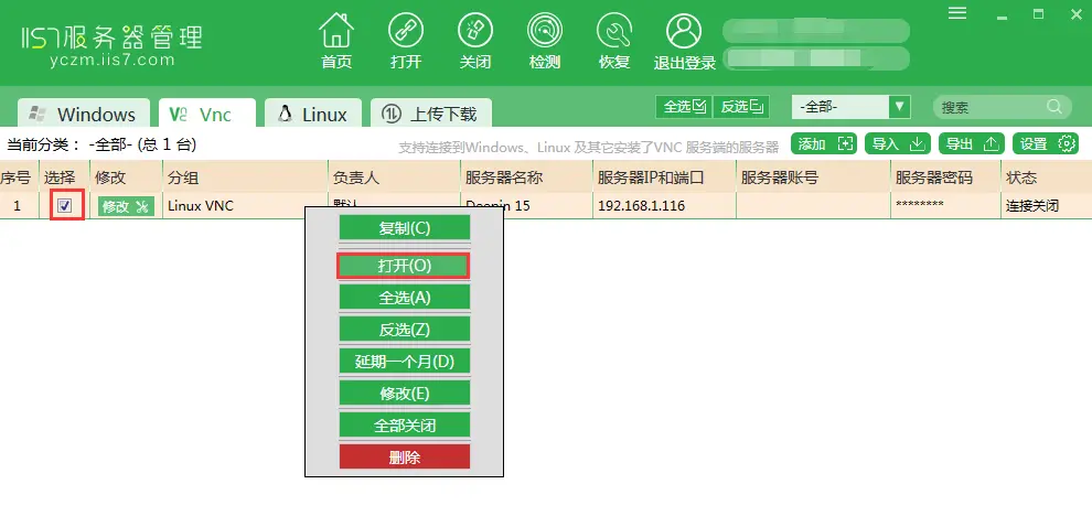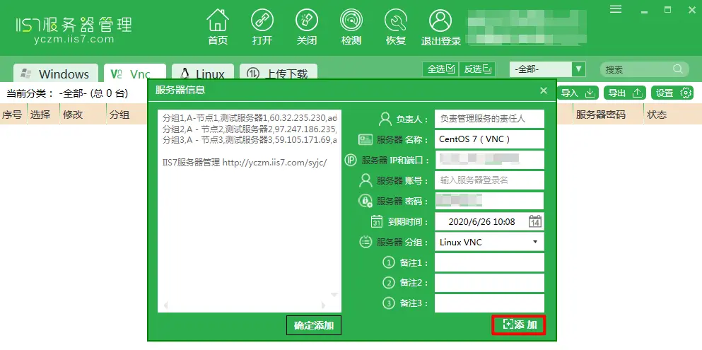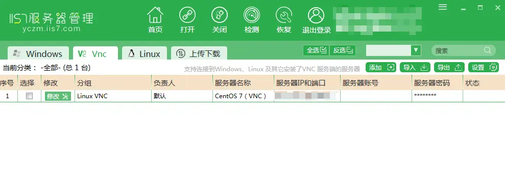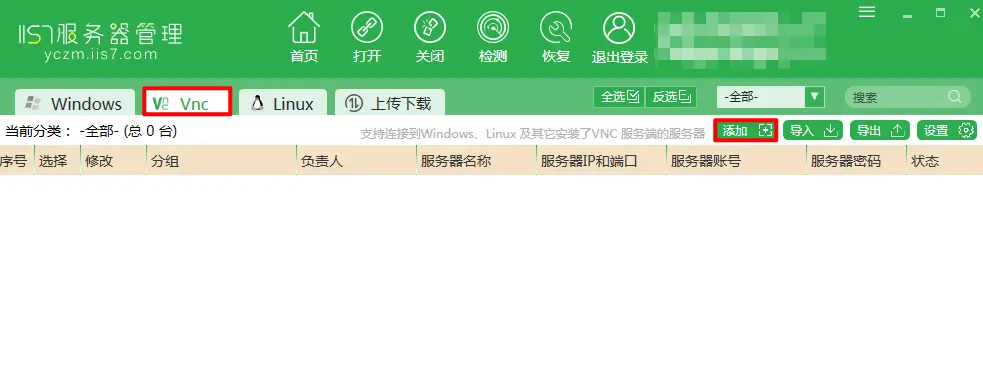2.1 首先打开服务器管理工具,切换至Vnc选项后点击上面的添加按钮。