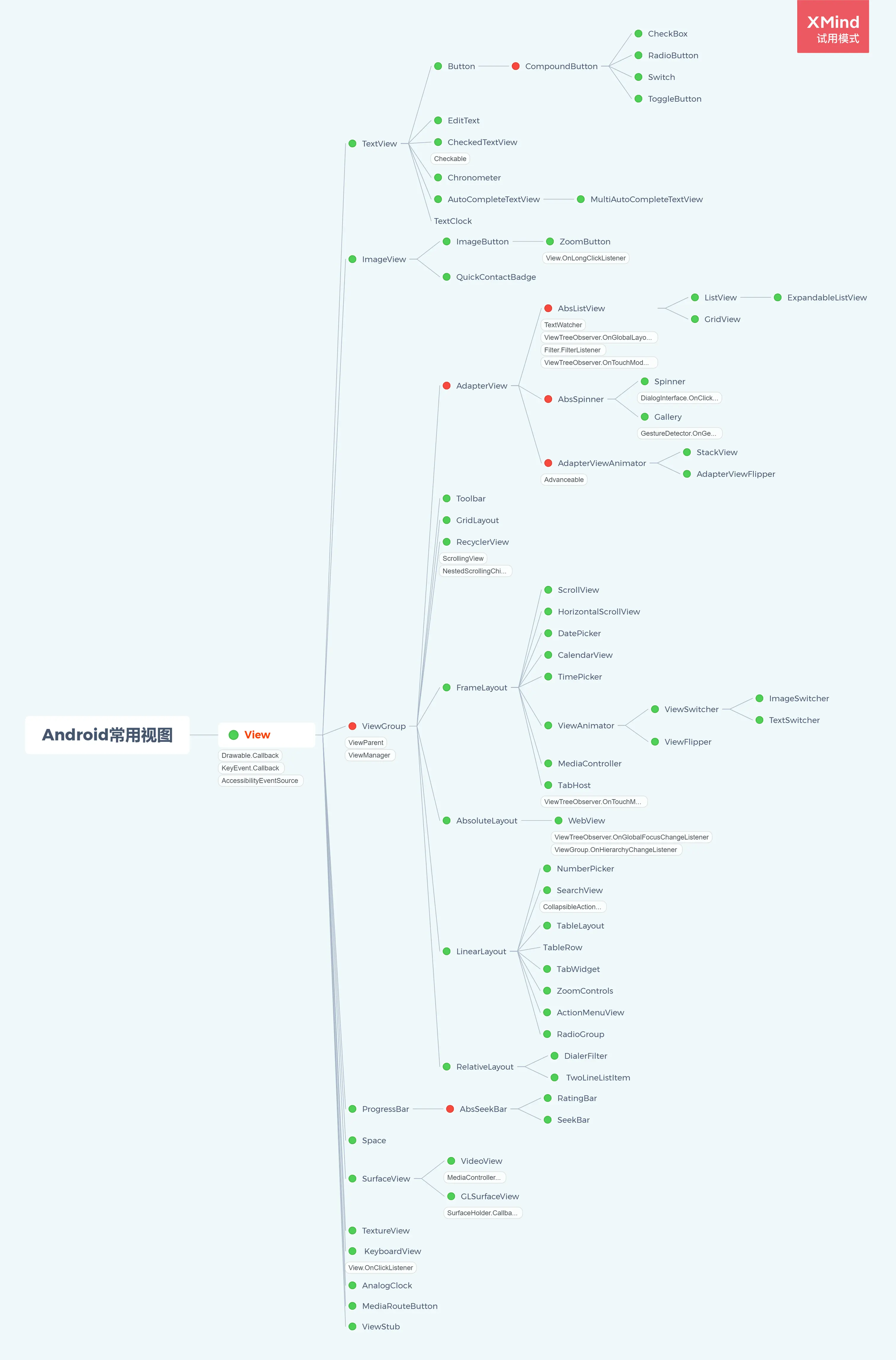 疫情期间打算学习了解下安卓开发,在熟悉常用视图的时候感觉各种各样不同的视图太多,一个个的去记忆用法效率太低,所以就想着是不是可以梳理一下常用视图之间的关系形成一个个有联系的图,然后再去理解是不是会好理解些,学习效率也会提高了。所以就根据官方文档,梳理了android.view和android.widget两个模块中常用的视图,并通过思维导图绘制了继承链关系,以后每次想了解哪个视图,只需要打开思维导图查看就可以了,方便快捷多了。