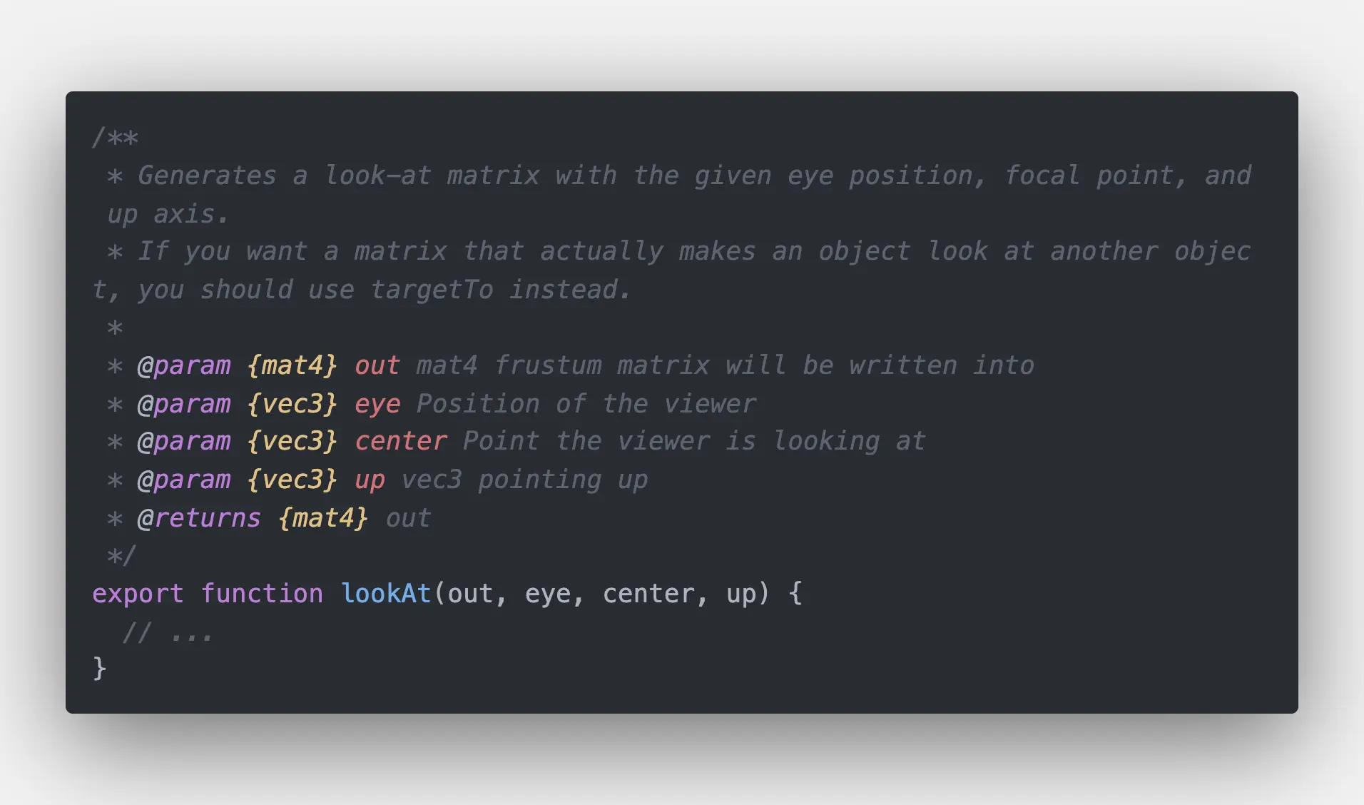 关于WebGL中使用的矩阵工具现在网上有很多的库,在这里推荐大家使用大名鼎鼎的antv的矩阵工具,矩阵工具路径为:@antv/gl-matrix/src/gl-matrix/mat4.js,lookAt函数如下图: