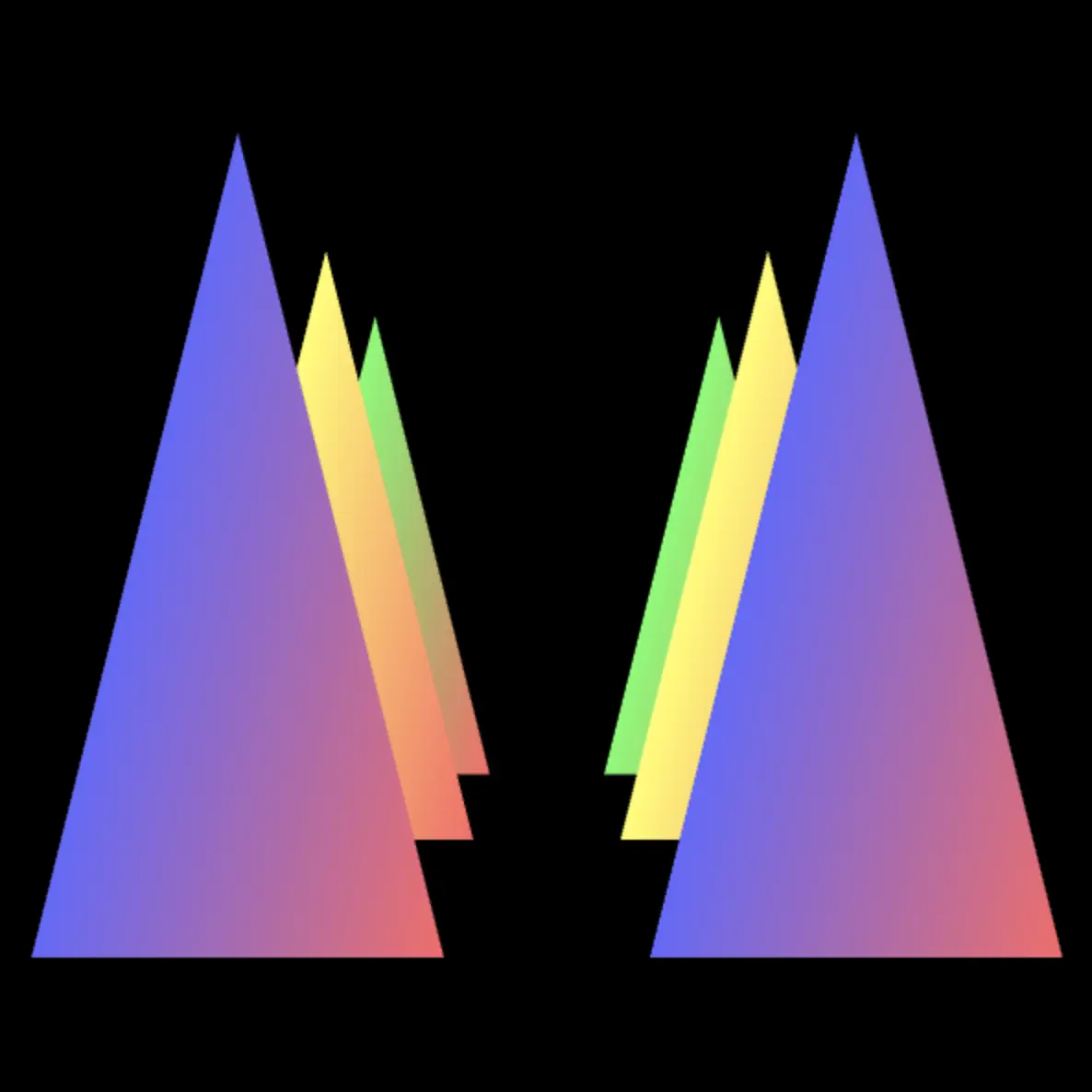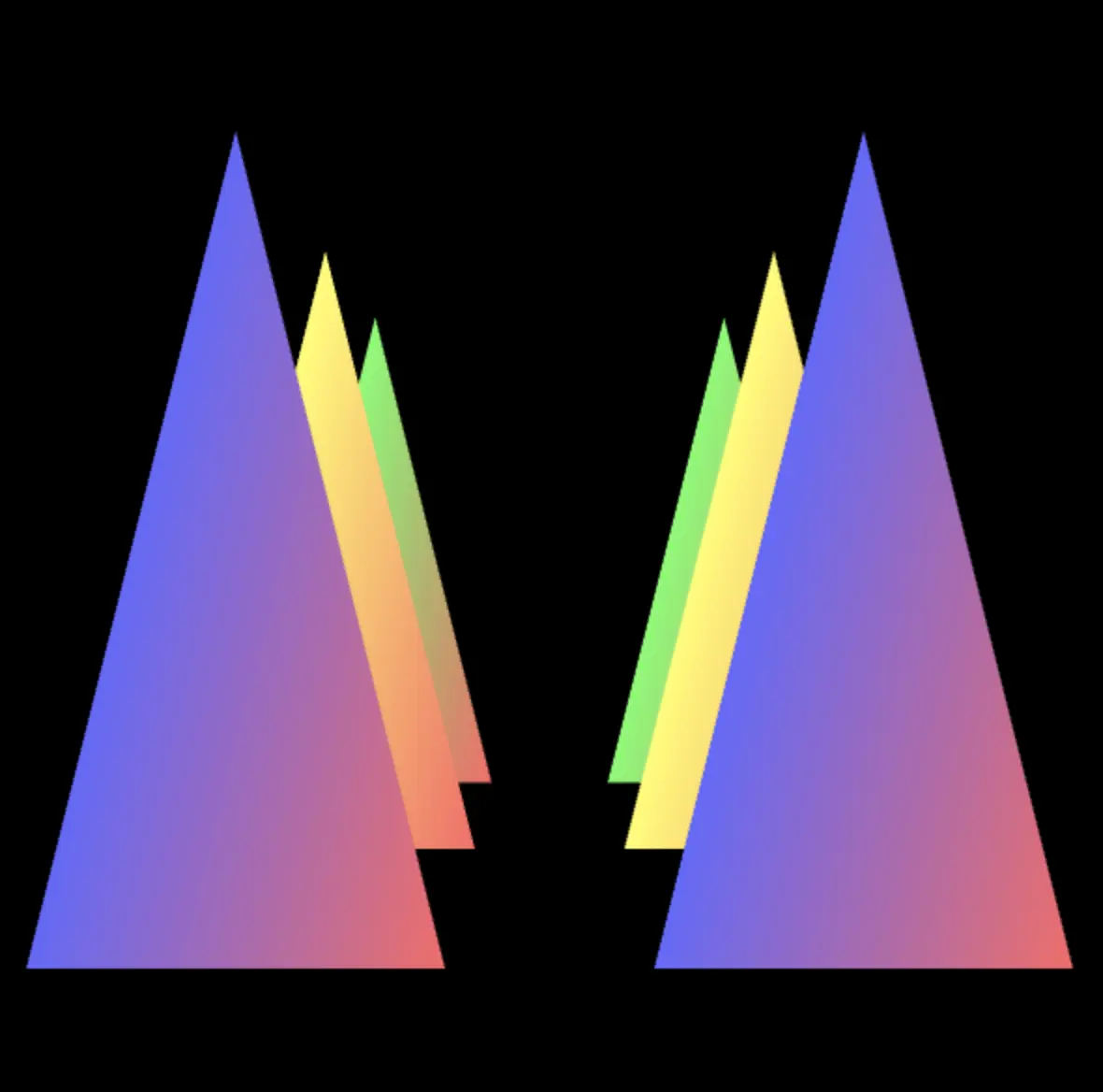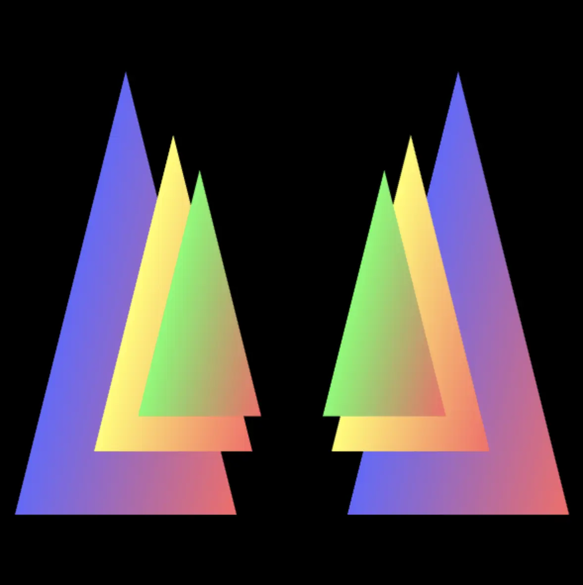 上面的例子中我们定义的三角形信息的顺序是从后向前:绿色三角形→黄色三角形→蓝色三角形,假如说我们把绿色三角形和蓝色三角形的定义顺序交换一下呢?