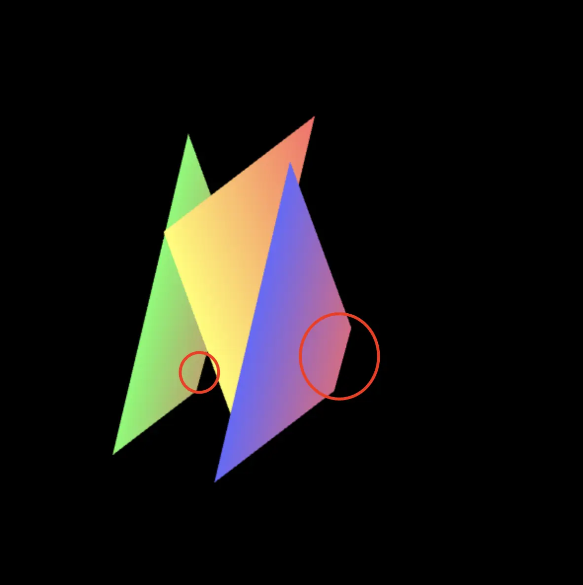 会发现又出现问题了!虽然绿色三角形的z轴坐标是-4.0也就是在三个三角形的最后面,但是因为交换了三角形数据的顺序,绿色三角形却显示在了最前面😱这可不是我们想要的结果!事实上,WebGL是按照缓冲区中的顺序来绘制图形的,后面绘制的图形会覆盖前面已经绘制好的图形,这样就产生了近处三角形遮挡远处三角形的效果。但是当我们将蓝色和绿色的顺序交换之后,绿色三角形的顶点信息就成为了缓冲区中的最后一个,所以绿色三角形会覆盖在前面绘制的两个三角形之上。如何解决这个问题呢?这时候我们就要开启深度测试: