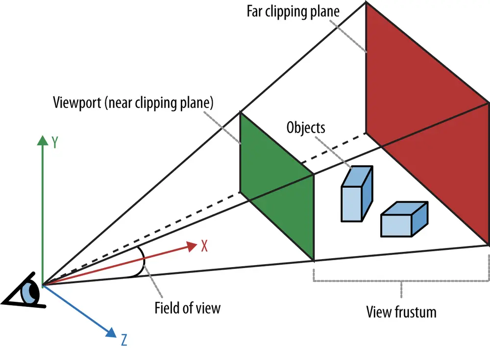 透视投影产生的可视空间并不是四四方方的立方体,而是一个平截头体,像一个被截断的金字塔(图片来源):