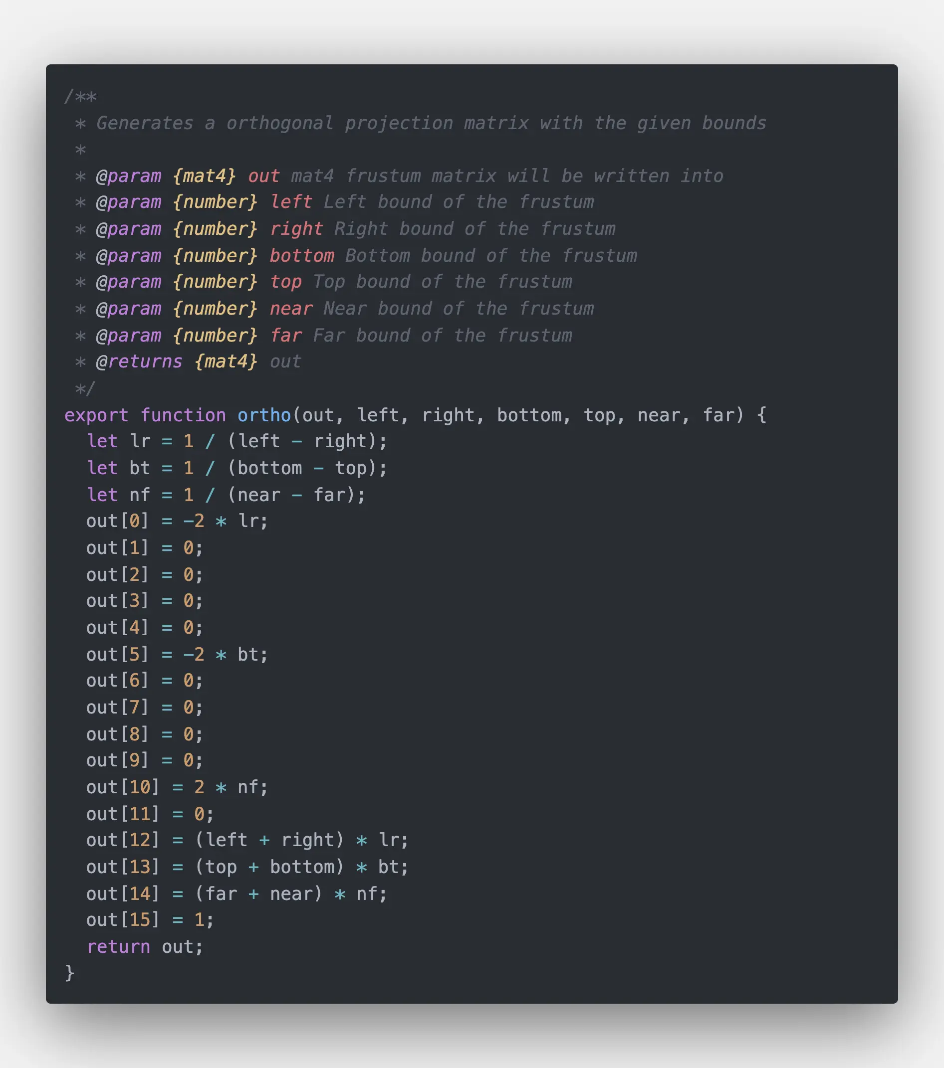 让我们来看一下antv中设置正交投影矩阵的函数,来验证一下我们的推导过程是否正确:
