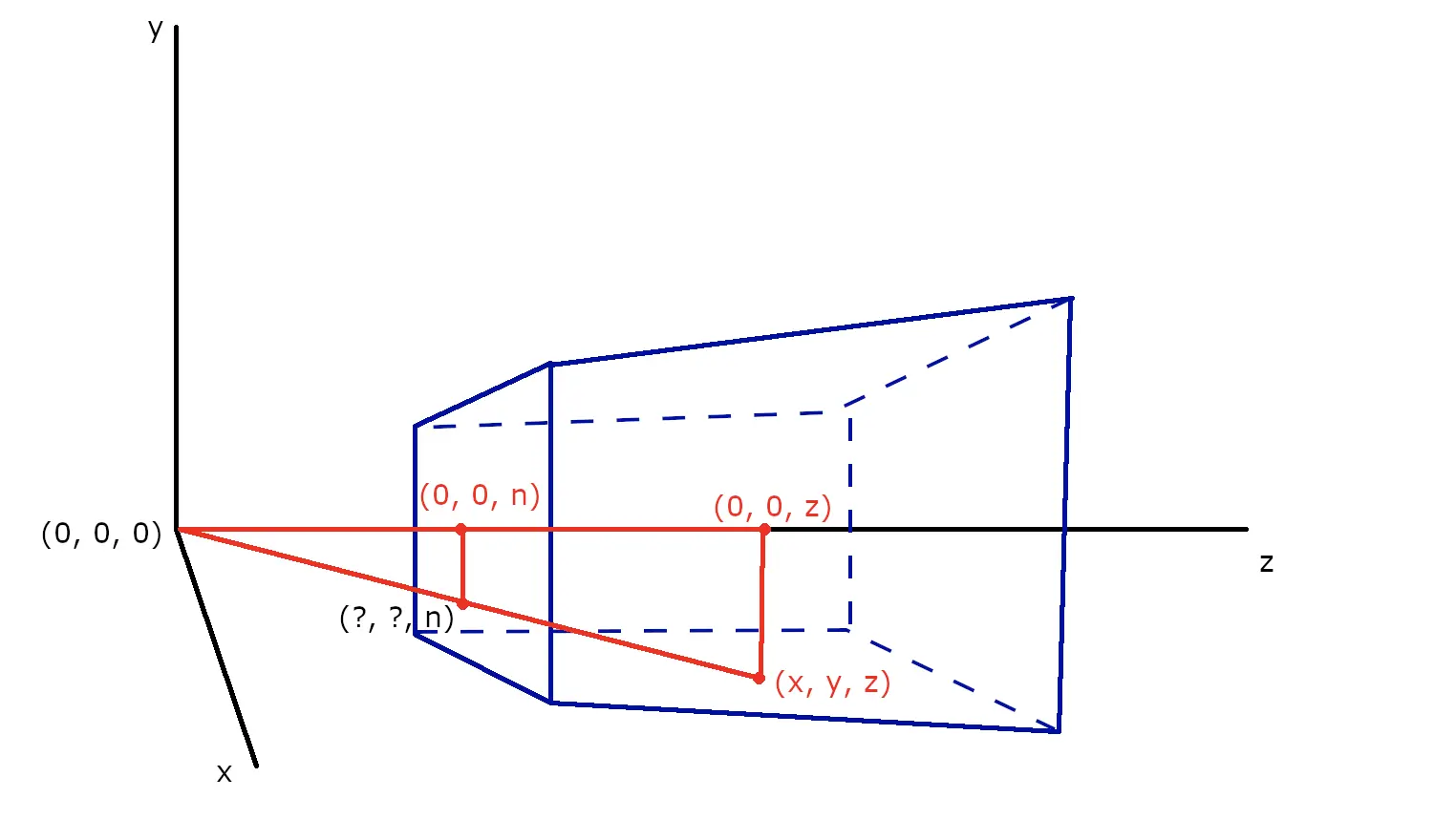 我们需要把可视区域内的点(x, y, z)投影到近裁剪面上也就是(?, ?, n)点,那么我们如何求出(?, ?, n)点的坐标呢?这就需要利用到三角形相似了,利用三角形相似可以很快速的求得投影到近裁剪面上点的坐标为(坐标1):