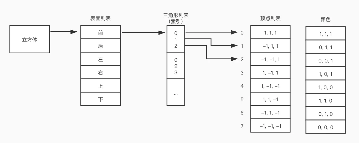 首先我们将立方体分为:前、后、左、右、上、下六个面,每个面都由两个三角形组成,每个三角形对应一个索引数据,而每条索引数据中存储着每个顶点的索引值,而每个索引值对应的顶点信息就包含顶点的坐标以及颜色的数据。具体实现代码如下: