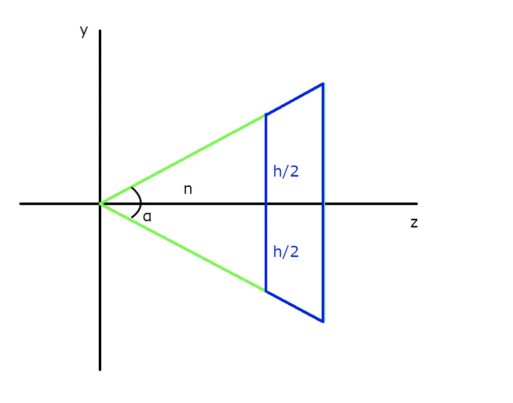 如上图垂直可视范围为角α,视点到近裁剪面的距离为n,蓝色部分为可视区域,近裁剪面的高度为h,那么我们就可以得到: