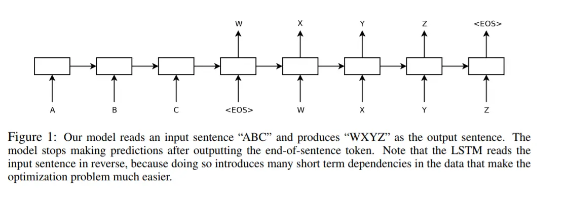 图一:论文中seq2seq结构(arxiv.org/pdf/1409.32…) seq2seq模型的encoder非常简单(上图中ABC对应的部分),就是RNN,可以是多层(GRU,LSTM)。decoder在训练和测试的时候,稍微有点不同。decoder训练的时候输入由两部分组成,一部分是encoder的last state,另一部分是target序列,如上图中的第一个 WXYZ;其中两个表示的是序列开始符和结束符;decoder测试的时候输入也是由两部分组成,一部分是encoder的last state,另一部分是来自于上一个时刻的输出(上一个时刻的输出作为下一个时刻的输入),直到某个时刻的输出遇到结束符为止。 但是seq2seq有一个很明显的缺点,即无论之前的encoder的context有多长,包含多少信息量,最终都要被压缩成一个固定维度的vector。这意味着context越大,decoder的输入之一的last state 会丢失越多的信息。这就会导致当输入自然语言长度越长,模型丢失的信息就越多,表现的就越差。