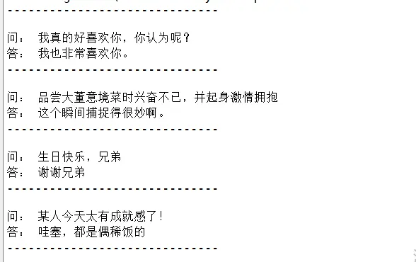 图四:训练结果(train.py) 在训练完成之后,会把训练模型存放在model文件夹下,然后我们运行chat_robot.py,我们就能看见图五聊天机器人的结果了。如果还想添加更多的聊天语料的话,请将question.txt和answer.txt放在corpus文件夹中,在重新进行模型训练即可。