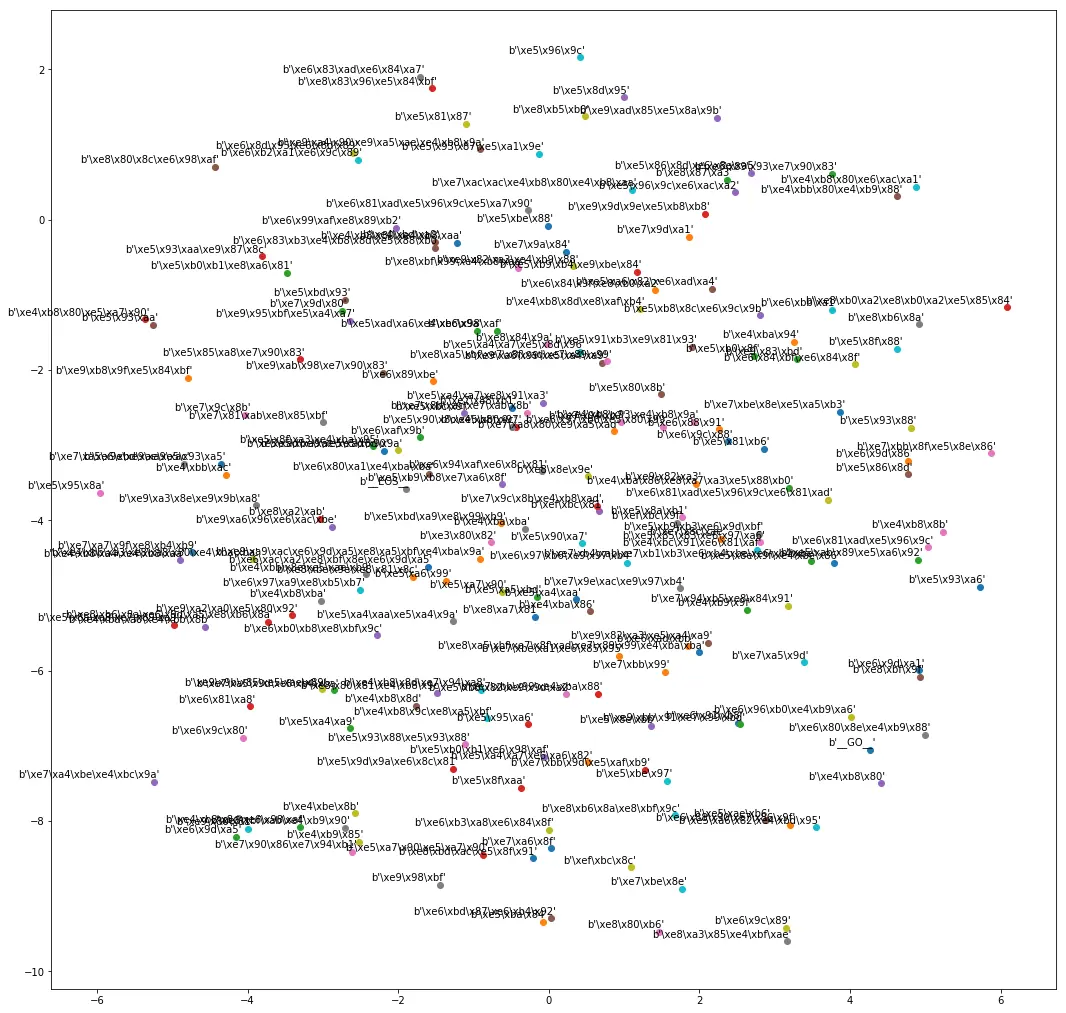 还可以通过word2vec_plot.py看到word2vec向量分布图,效果如图六所示。