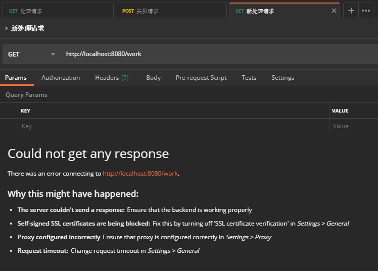 然后,我们启动项目,先用 Postman 请求 http://localhost:8080/work 处理业务: