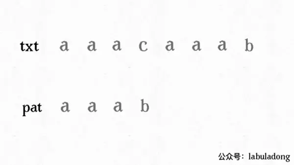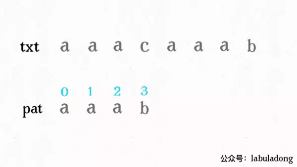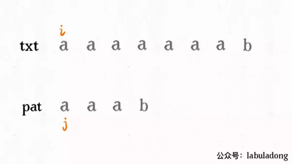 再比如类似的 txt = “aaaaaaab” pat = “aaab”,暴力解法还会和上面那个例子一样蠢蠢地回退指针 i,而 KMP 算法又会耍聪明: