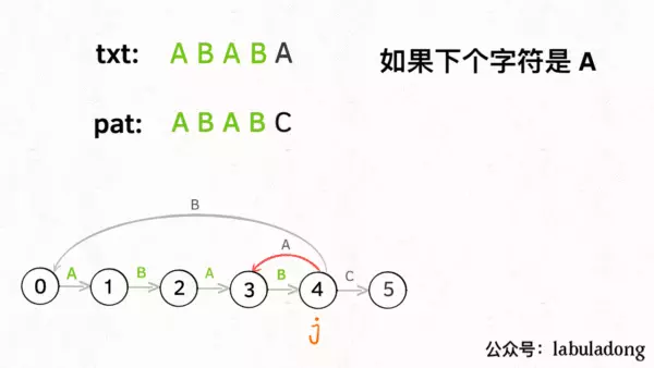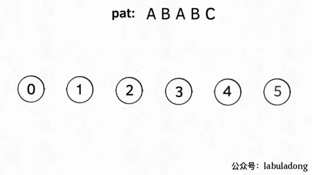 如上图,圆圈内的数字就是状态,状态 0 是起始状态,状态 5(pat.length)是终止状态。开始匹配时 pat 处于起始状态,一旦转移到终止状态,就说明在 txt 中找到了 pat。比如说当前处于状态 2,就说明字符 “AB” 被匹配: