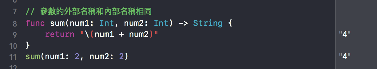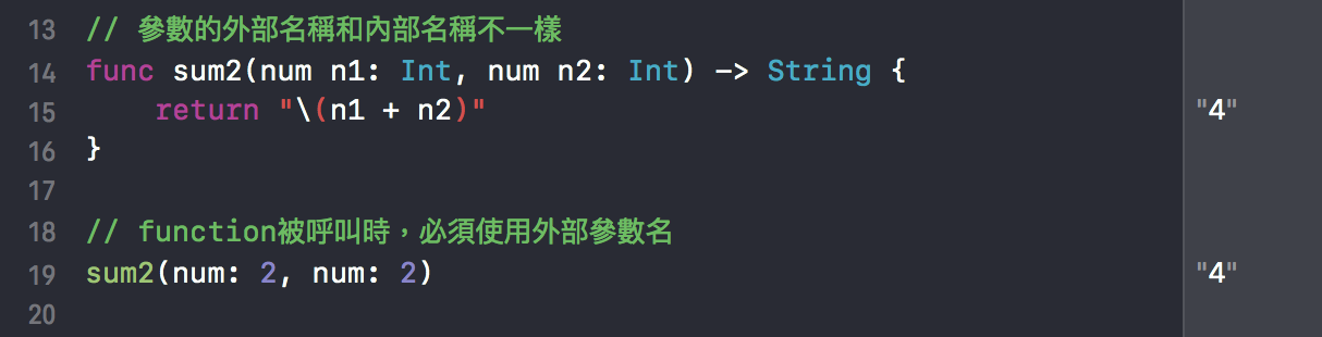 在swift中,一个参数有两个名字:内部参数名、外部参数名。