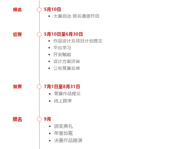 比赛各赛段,参赛队伍须按照要求按时、合规地提交参赛作品。由评审组评审通过后方可进入下一赛段。