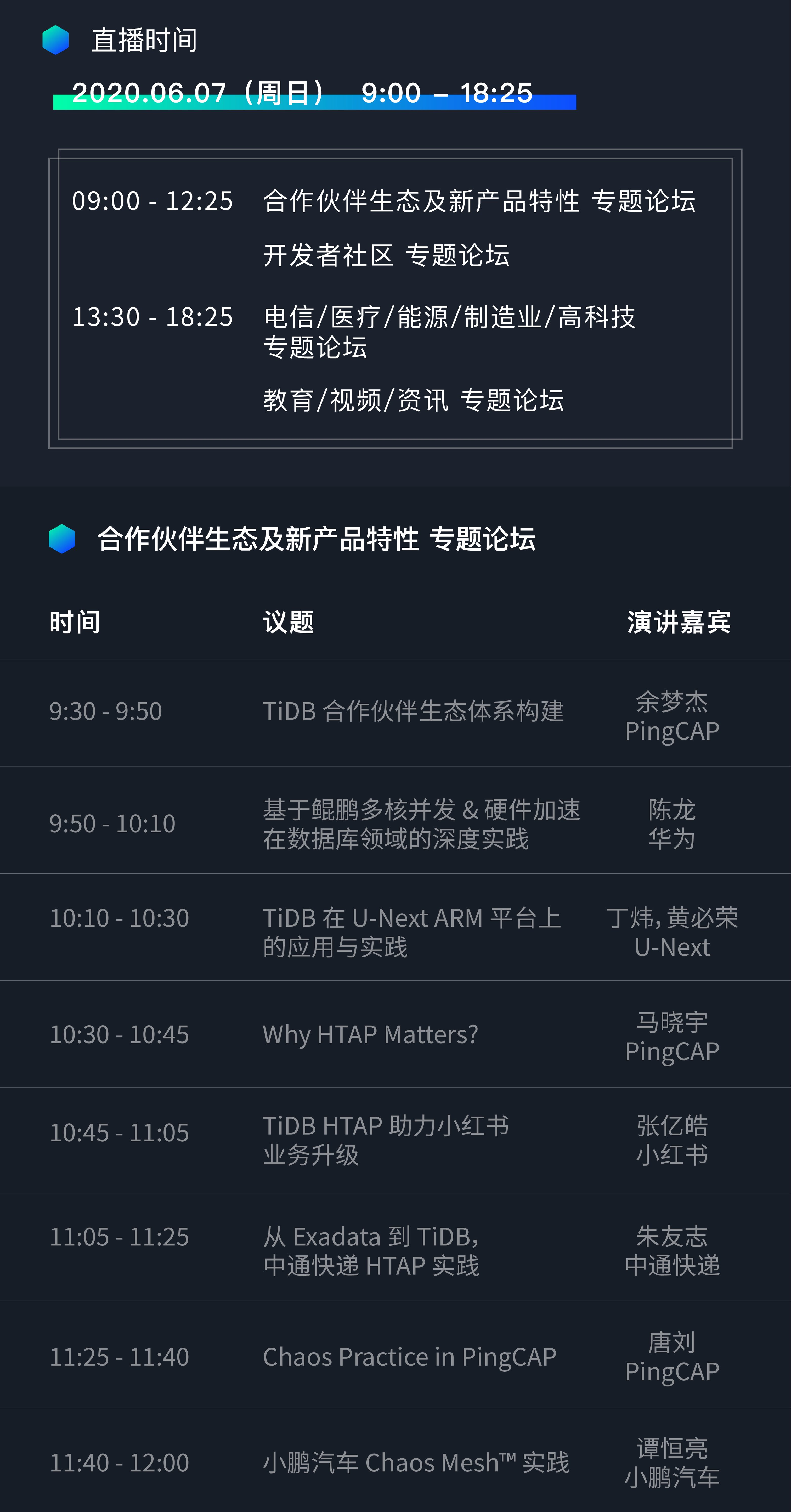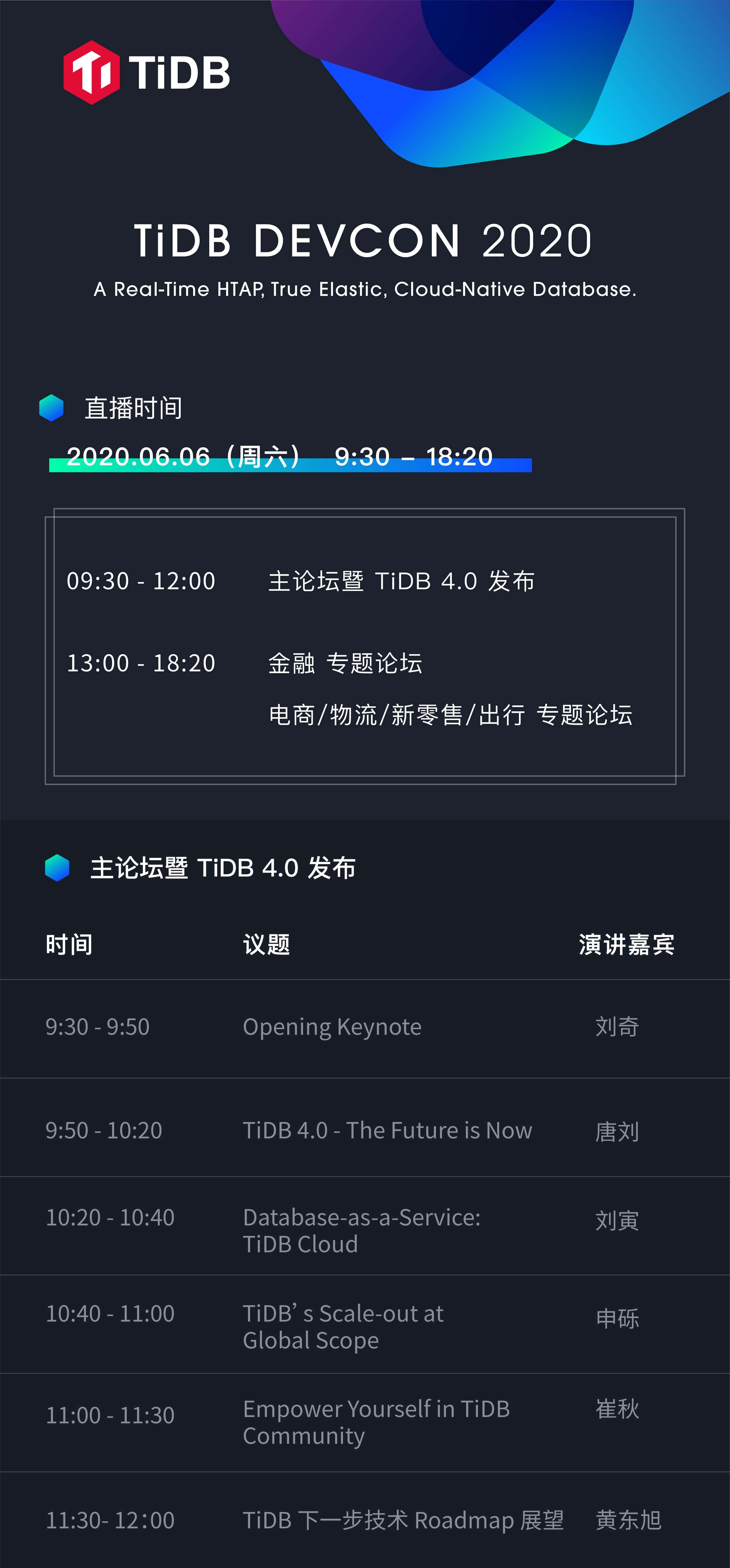 TiDB 社区年度最高规格的技术大会——TiDB DevCon 2020 将于 6 月 6~ 7 日开启直播。