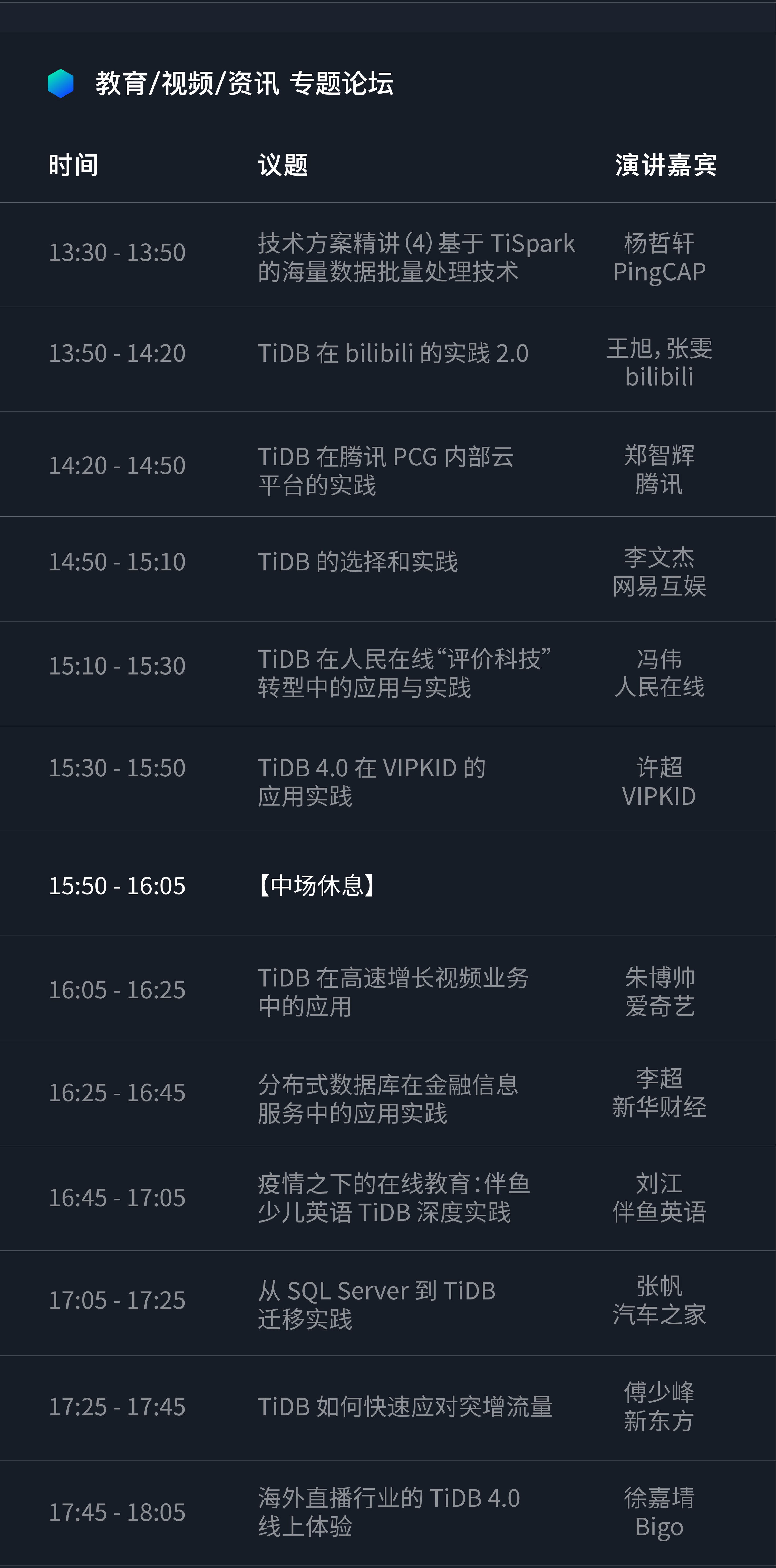 TiDB DevCon 2020 已于上周开启报名,80+ 干货议题将在 6 月 6 ~ 7 日的直播中呈现,来自全球各地的 TiDB 开源社区的开发者、用户及合作伙伴将一齐见证 TiDB 里程碑 4.0 版本的发布,并分享自己的经验; 此外 4 个 PingCAP 技术方案精讲也将在此次大会上亮相: