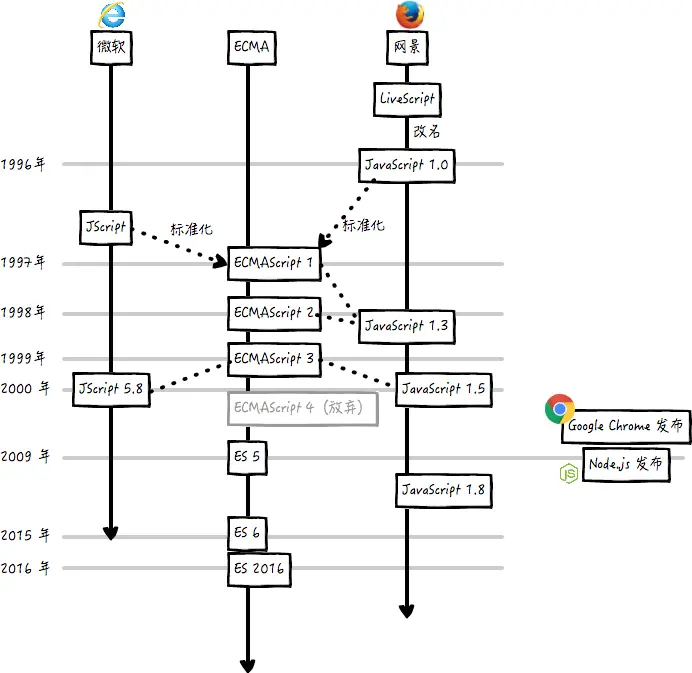 上图按照时间顺序说明了 JavaScript、JScript 和 ECMAScript 的发展。