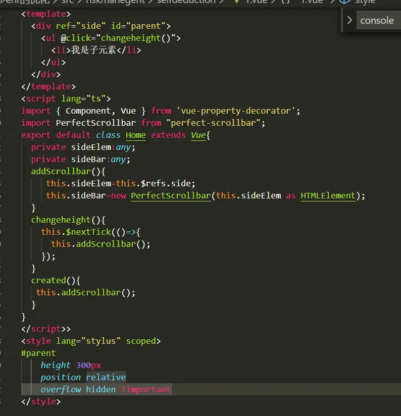 这个组件的引用十分的简单,基本就是外层给一个高度固定的div,初始化之后,内部元素高于外包就会开始滚动。基本就是上述这样是最简单的模式。我的项目是vue+ts的所以写法稍有不同。