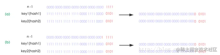 来看看核心判断条件(e.hash & oldCap) == 0。这里oldCap=16,就是Hash值与10000进行与运算(只有两个数都为1,结果才为1)。计算结果也就是判断Hash值的第5个bit位是否等于0。这里为什么要判断第5个bit位呢?因为之前计算桶下标的时候是直接取的hash值的前4位,如果扩容后,计算t桶下标方式就是(hash & (newCap - 1)) ,newCap =32,也就是hash & (100000-1),也就是与11111进行或运算,得到的结果就是hash值的前5位。看到这里不知道你是否有点迷糊,那就看个图。