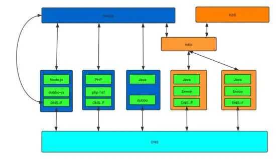网格外dubbo -> 网格内dubbo:注册中心 网格外dubbo -> 网格外dubbo:注册中心 网格内dubbo -> 网格外dubbo:域名 => dns-f => 注册中心 网格内dubbo -> 网格内dubbo:域名 => dns-f => dns 异构语言(PHP、Node)可通过服务名直接发起调用,由DNS-F拦截,解析为正确IP地址,且负载均衡策略可调整 同时nacosAP模式的高可用与写的可扩展性、可对接CMDB等等特性也是选择的考虑因素之一。