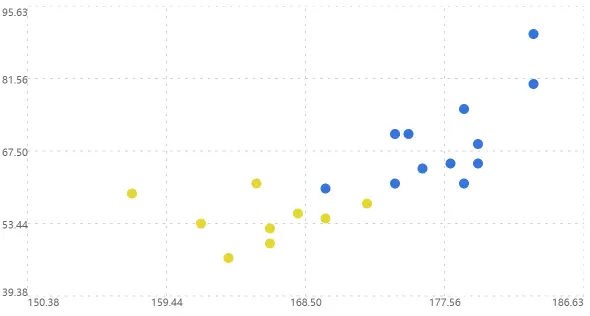 散点图也叫 X-Y 图,它将所有的数据以点的形式展现在笛卡尔坐标系上,以显示变量之间的相互影响程度,点的位置由变量的数值决定。假设我们向要将男女生的升高体重展示在散点图上,数据格式如下: