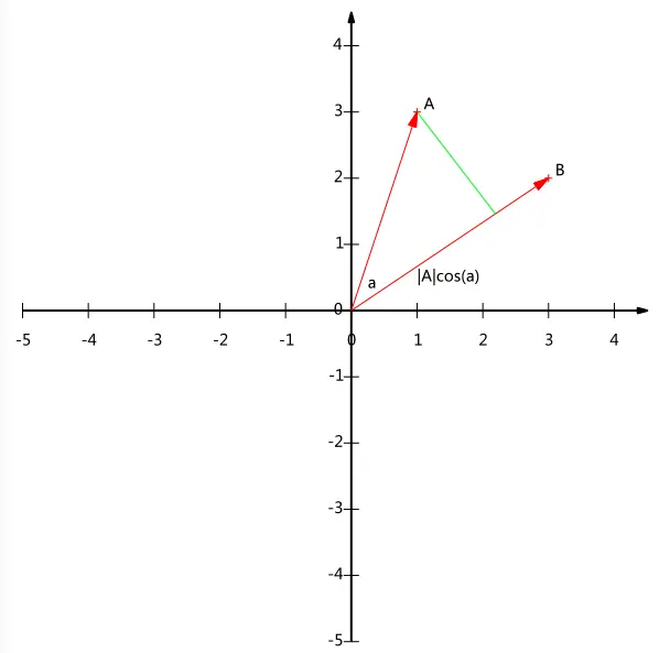 好,现在我们从A点向B所在直线引一条垂线。我们知道垂线与B的交点叫做A在B上的投影,再设A与B的夹角是a,则投影的矢量长度为,其中