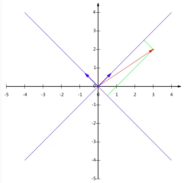 现在,我们想获得(3,2)在新基上的坐标,即在两个方向上的投影矢量值,那么根据内积的几何意义,我们只要分别计算(3,2)和两个基的内积,不难得到新的坐标为。下图给出了新的基以及(3,2)在新基上坐标值的示意图: