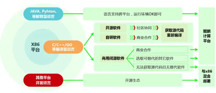 第二类是 C、C++ 或 Go 等编译型语言。这类应用需要采用 ARM64 的 GCC 编译器重新编译即可运行,只要有源代码就不用担心;如果没有源代码,华为也提供了相关的方案,下文详述。