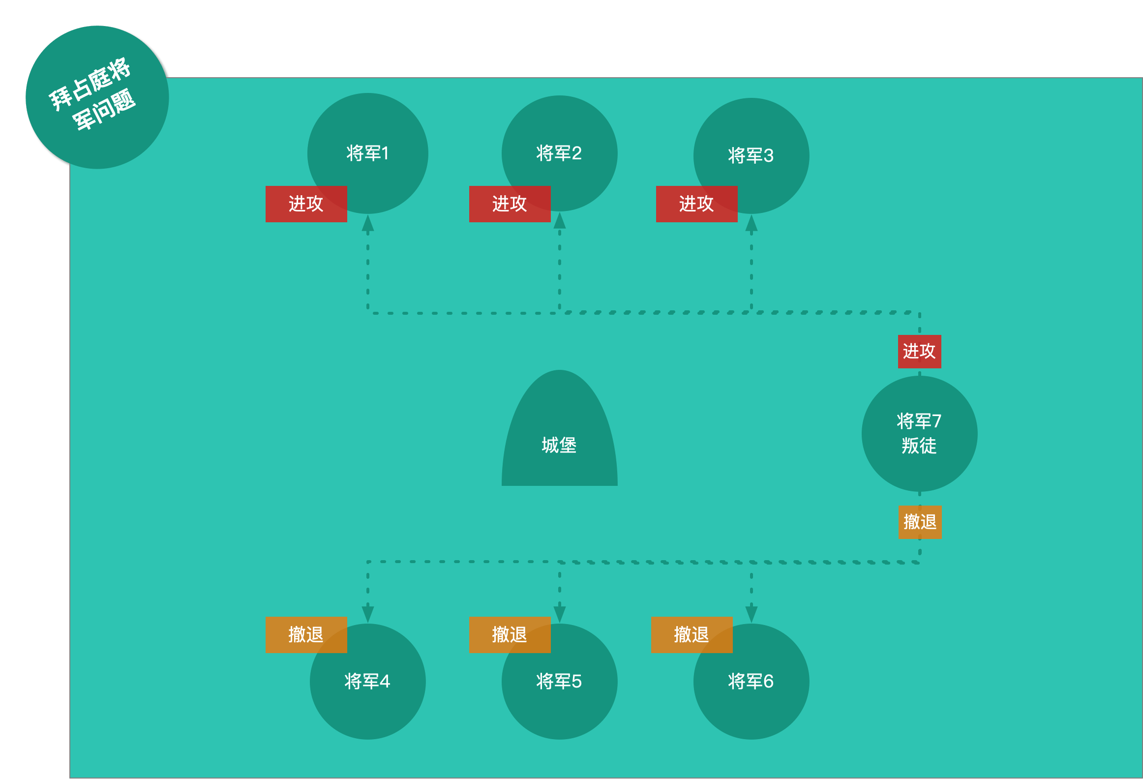 一组拜占庭将军分别各率领一支军队共同围困一座城市。为了简化问题,将各支军队的行动策略限定为进攻或撤离两种。因为部分军队进攻部分军队撤离可能会造成灾难性后果,因此各位将军必须通过投票来达成一致策略,即所有军队一起进攻或所有军队一起撤离。因为各位将军分处城市不同方向,他们只能通过信使互相联系。在投票过程中每位将军都将自己投票给进攻还是撤退的信息通过信使分别通知其他所有将军,这样一来每位将军根据自己的投票和其他所有将军送来的信息就可以知道共同的投票结果而决定行动策略。